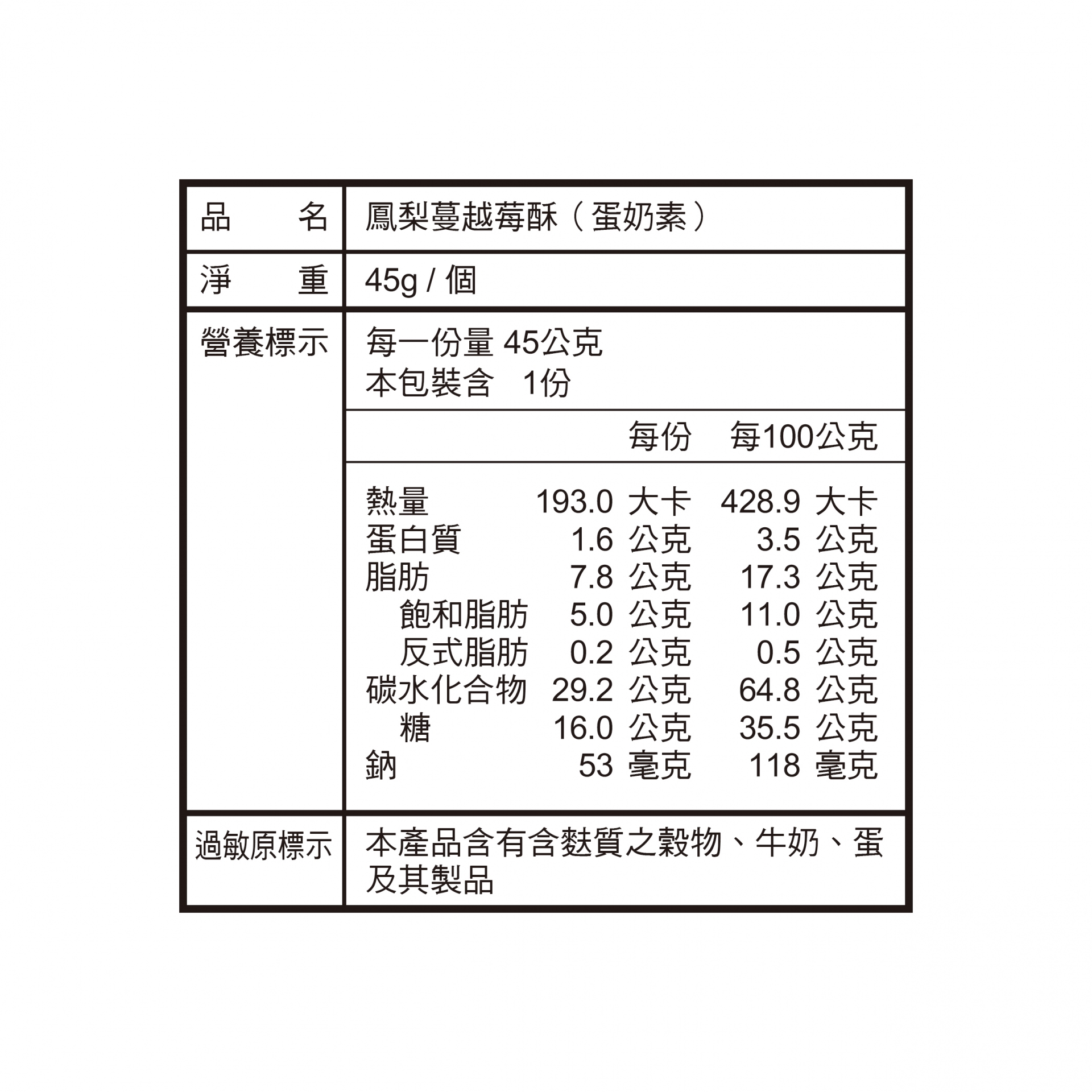 過敏原資訊:本產品含有含麩質之穀物、牛奶、蛋及其製品